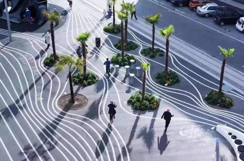 人對于不同色彩,不同質感的鋪裝材料,心理所受的暗示是不同的;利用這一點,采用不同的材質對不同的交通區間進行劃分,加強空間的識別性,同時約束人們的行為。